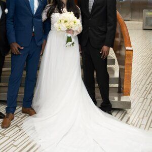 Selling Mori Lee wedding dress size 8. In excellent condition. Length is designed to be adjusted with a clip on option to the back. Only wore it for 15mins for my signing ceremony. Originally bought it for $1400 and now selling for $500.