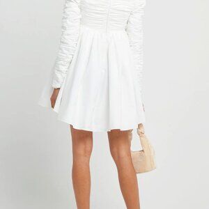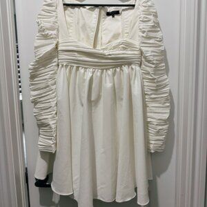 The mini length and full skirt of this adorable babydoll dress are paired with a structured bodice and long, ruched sleeves.