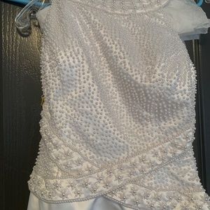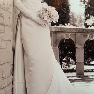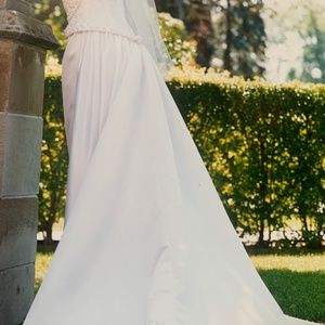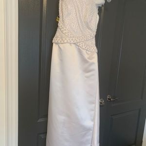 Stunning white satin wedding gown with pearl bodice and detachable train