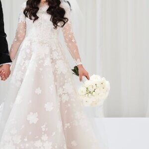 Magnificent and timeless, this elegant wedding gown is exquisitely crafted in Switzerland from the finest Swiss lace. Delicate sheer tulle graces the sleeves, chest, and back, creating a romantic, ethereal effect. A row of covered buttons trails down the back, leading to a sweeping cathedral train for a breathtaking bridal silhouette. Bustle it up after the ceremony and dance the night away in unforgettable style.