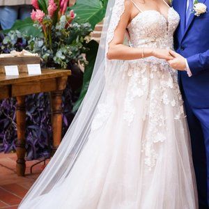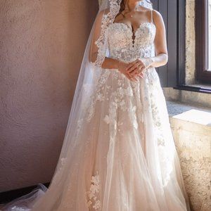 Gorgeous ivory lace, tulle, and Moscato Regency organza ballgown wedding dress with a sheer bodice, size 4-6. Strapless, but detachable thin straps have been added. The sparkling floral-encrusted bodice features pops of organic flowers embroidered with rich beading over thin, sheer sequin and textured tulle layers for high shine. The floral details reach across the deep plunge of the structured sweetheart neckline, and over the waistline to add dimension to the full, rich skirt. The back of the sheer bodice zips beneath fabric-covered buttons before flowing into the seamless, full train featuring multiple layers of tulle and Cali chiffon with floral details lightly showered throughout.
