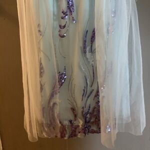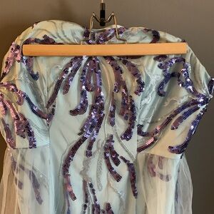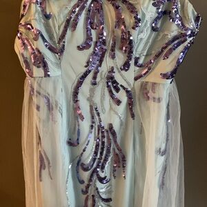 Stunning gown with purple sequins and sheer overlay. Perfect for formal events.