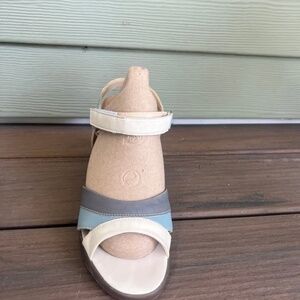 Wedge sandals. Good condition, used 1 time. Soft and nice leather-like material, rubber sole - 1,5 cm, heel part - appr. 7,5 cm total. Velcro stripe for ankle. Has some scuffs on the sole.