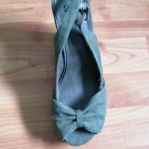 High heeled wedged shoes. Open toed. Camo cork like heel. Comfortable! Fantastic condition. Little buckle on the side. Fun detailing on the toe.