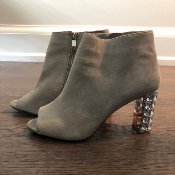 Beautiful heel details. Peep toe. Worn twice. Like new, no scratches on the grey suede.