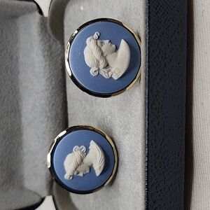 Vintage WEDGWOOD cufflinks. The design is the Muses.These cufflinks are stamps of the plaques, Wedgwood England, and also on the gold metal surrounding blue enamel. These Wedgwood cufflinks are in good condition has stain on the enamel see pictures or the gold coloured metal is good condition.