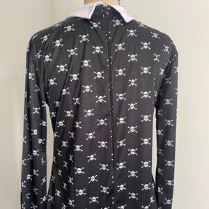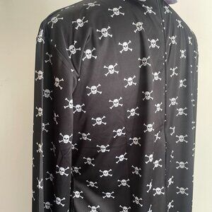 Features a classic white collar and cuffs with an all-over white skull and crossbones pattern