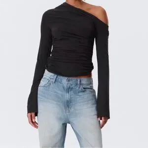 Chic asymmetric top with elegant ruching. Ideal for modern style. Great condition. Same top pictured on model for fit reference. Size small. Love the sleeves on this