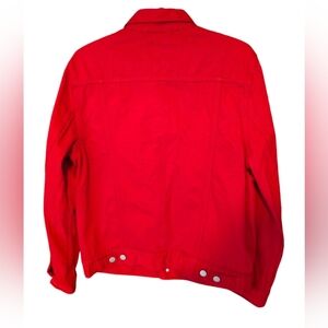 Bold red jean jacket. Classic button-up design. Features chest pockets.