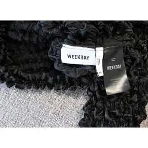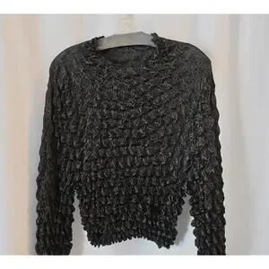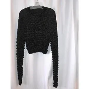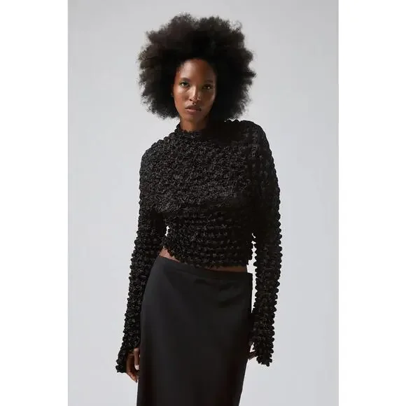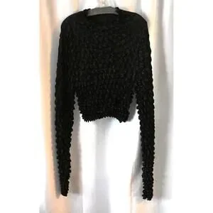 Chic and unique black long sleeve crop top with a distinctive textured fabric design. Perfect for adding a stylish edge to your casual or night-out wardrobe. Comfortable fit with a slightly high neck and extra long sleeves for a trendy look.
