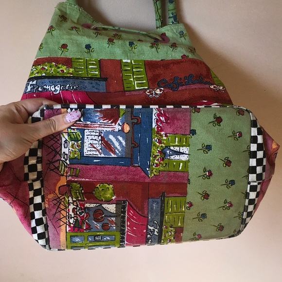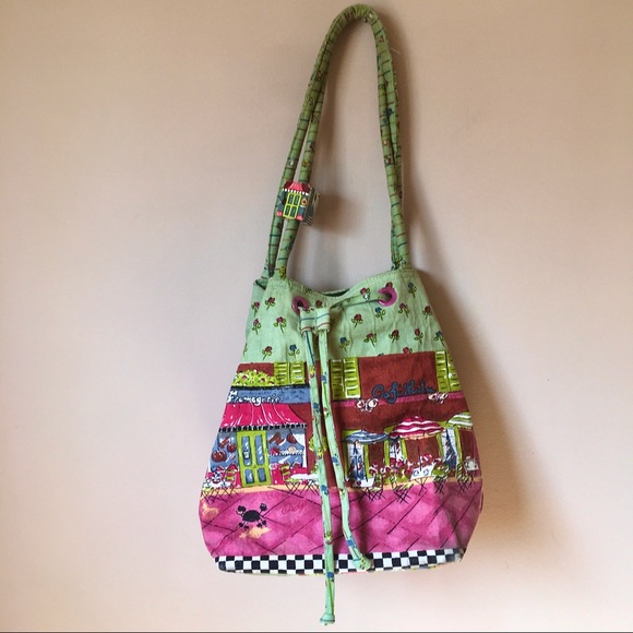 Decent sized green handpainted vintage canvas bag. Shows an all over scene of tables / chairs outside of βCafe Luluβ w striped awnings and black poodle. Nice checkerboard border accent at the base.