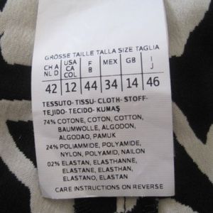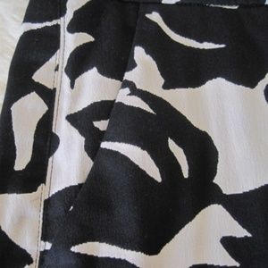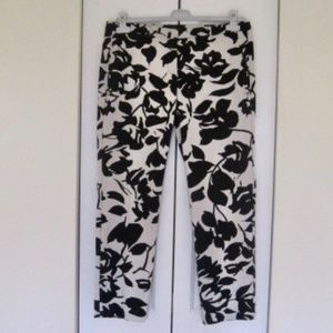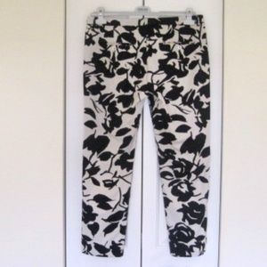 Weekend Max Mara slim cigarette cropped pants. Color: Black/Off White. SIZE: 12. (waist measures 17.25") Pants feature a luxe floral printed design. Zip fly closure ,banded waist with belt loops. Concealed fastening, front slip pockets, back button pockets. Fabric Content: Fabric Content: 74% Cotton, 24% Polyamide, 2% Elastane. Pants are in very good pre-owned condition. Minor overall wear. No stains or rips. Pants has been freshly dry cleaned for the listing. NOTE: Due to inconsistencies of various monitors and lighting sources, the actual color may vary from the images show.