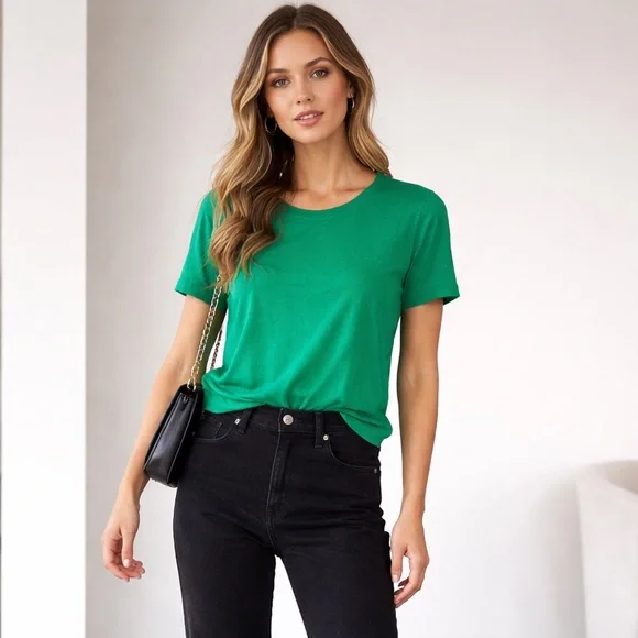 Crafted in a lightweight, fine knit, this piece drapes beautifully with a soft, fluid feel against the skin. Silk - Cotton blend The rich emerald tone is vibrant yet sophisticated — stunning with black denim, tailored trousers, or layered under a blazer. The classic crew neckline and clean short sleeves keep the silhouette polished and versatile.