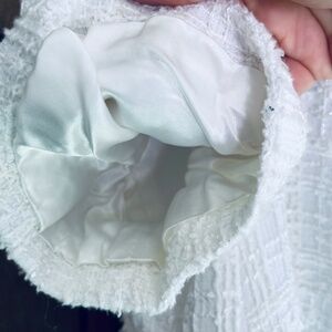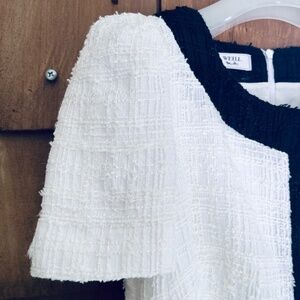 Elevate your wardrobe with this chic Weill Paris career dress, a blend of classic design and modern elegance. Available in a versatile size 12, this knee-length pencil dress features a crisp white and black color scheme, complemented by contrasting trim and boucle fabric that adds a distinctive texture. The dress is crafted from a luxurious mix of cotton and polyester, ensuring both comfort and durability, while the cashmere lining provides an extra touch of sophistication.