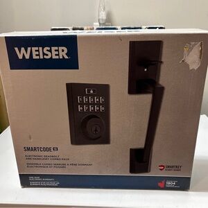 Weiser SmartCode 10 electronic deadbolt with handle. Features a keypad entry system. Sleek black finish.