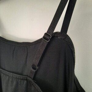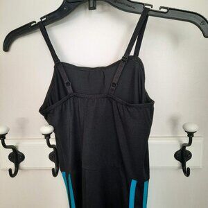 Shiny spandex unitard has adjustable straps and double side striped bottoms