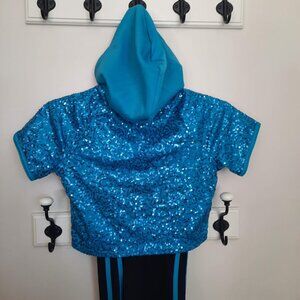 Cropped short sleeve hoodie is sequin spandex with stretch polyester hood