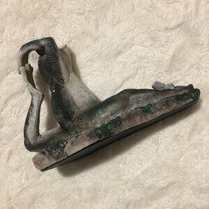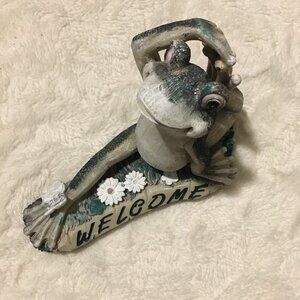 Very good preowned condition garden statue of a yoga frog stretching with a 'welcome' message below. A cute little butterfly has come to say hello. In good shape. The painting is crude in some areas, but intentional.