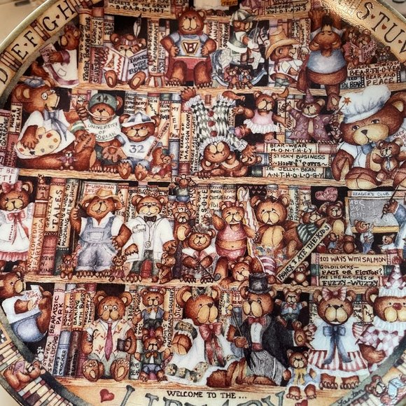Adorable with a capital A!!! Alas, I do not have a spot for this darling plate so here we are. Incredible details like book titles and bears dressed up as characters cover the plate. In pristine condition, no issues at all. First issue limited edition numbered plate, see pics for details. Work of Janice Tanton in collaboration with the Bradford Exchange. Approx 8" across.