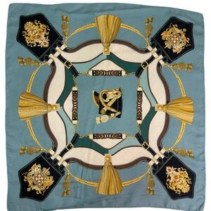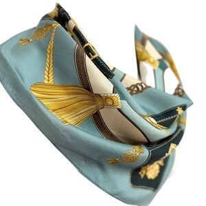 Elegant 100% mulberry silk scarf by Wensli, featuring a classic equestrian-inspired motif with ornate golden tassels, bridles, and regal crests on a teal blue background. This square scarf measures 21” x 21” and drapes beautifully thanks to its fine mulberry silk weave. Perfect for styling around the neck, as a headscarf, or tied to a handbag for a refined finishing touch. Excellent condition with no flaws — a timeless vintage-inspired accessory that elevates any outfit.