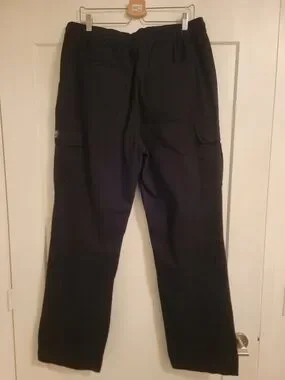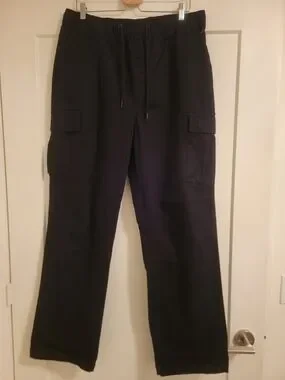Wesc cargo pants in solid black. Elastic drawstring waist for easy fit. Multiple flap cargo pockets for storage. Straight relaxed leg for casual wear. Clean, minimalist utility style.
