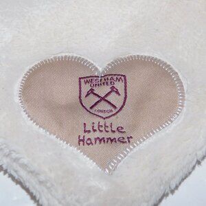 This hard to find West ham United FC Football Club Soccer Stratford London UK Cream Tan Little hammer Bear Plush Security Blanket Baby lovey nunu Soother is in Great clean soft condition. Blanket is 100% Polyester - Hand wash - air dry. Blanket portion measures 10" x 10" - Measures 16" from top of Bears head to bottom corner of blanket. Features heart patch on bottom corner with West Ham united London - Little Hammer.