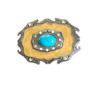 Western Belt Buckle Faux Turquoise Stone Cowboy Swirly Yellow Inlay Rhinestones