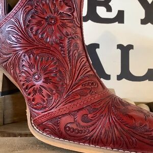 These Western hand-tooled leather booties showcase an amazing colour combination of deep red and ebony.