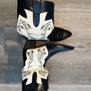 Black & white wide-fit cowbxy boots with dainty floral pattern in minimalist embroidery - worn once.