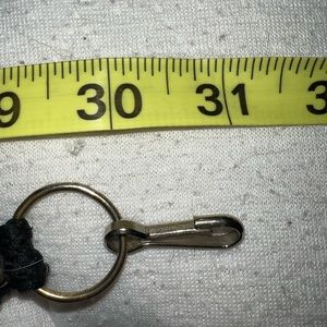 It’s 30in with some stretch. It’s in excellent condition. It clips together. It has metal medallions. There is no wear.