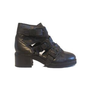 Black Leather Booties. Western buckle details on strappy chunk leather pieces. Never worn outside, virtually new. Lots of cut out / peek a boo details.