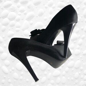 Elevate your party look with these stunning Westies "Tracy" black satin stilettos. Made in Mexico, these shoes have hardly any wear and are in excellent condition. Featuring a 4 1/2-inch heel with a 1 1/2-inch platform, these stilettos are perfect for adding a touch of glamour to any outfit. The beautiful black satin and cheeky front bow make them a must-have for any event.
