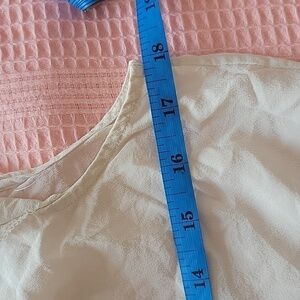 Delicate sleeveless popover top is adorned with eyelash lace for simple elegance. Center front seaming in vertical lines for slimming style.