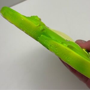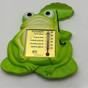 Whimsical 1972 Miller Studio Chalkware Frog Bathometer wall decor. In a cheery bright green shade to perk up your retro bathroom. This piece is in excellent preowned condition with no chips or cracks. There is a small chip in the paint on the very top of the umbrella, but it is not visible when hung on display.