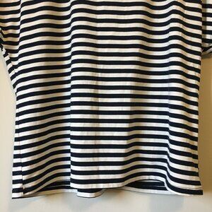 Very good preowned condition black and white stripe, short sleeve, white crochet lace shoulder top with a white tie back at the neck by Revolution. A fantastic piece.