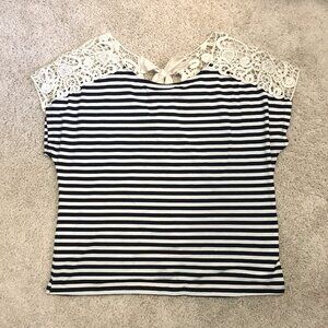 Very good preowned condition black and white stripe, short sleeve, white crochet lace shoulder top with a white tie back at the neck by Revolution. A fantastic piece.