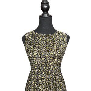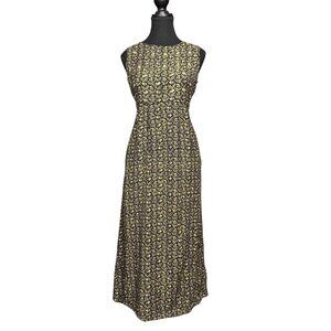 This vintage April Cornell maxi dress is a dreamy 90s piece blending whimsigoth charm with romantic prairie style. Crafted from soft rayon with a black base and golden yellow floral print, it features subtle embroidered flowers with a touch of sparkle for that perfect witchy-boho detail.