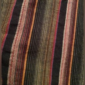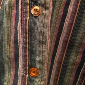 French Dressing whimsigoth button-up shirt with funky multicolour stripes, an open collar, and orange buttons.