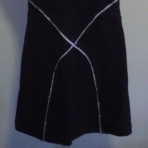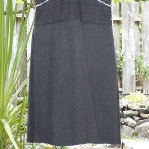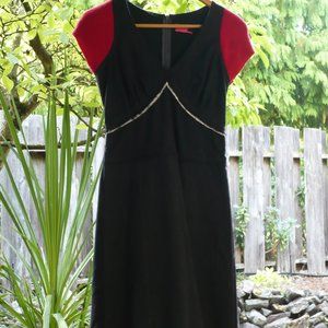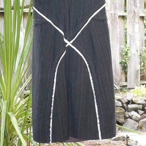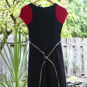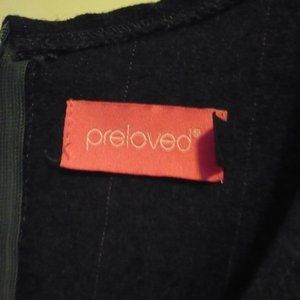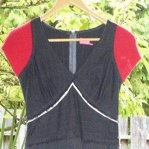 This beautiful dress is from a Toronto-based shop called Preloved that upcycles vintage fabrics and clothing. The fabrics used for this line was trousers, dress shirts and sweaters. Dress is almost black, a very, very dark grey overall. Bottom half is solid dark grey/black, while the waist and bust is an almost identical fabric with faint pinstripes. Back is also a nearly identical fabric with more obvious, but still faint alternating pinstripes. Red knit cap sleeves. Trim made from a grey floral patterned fabric is sewn under the bust. It is sewn together to have a frayed look in some areas (waist, bust, cross at back and trim). Almost 20 years old and in great shape.