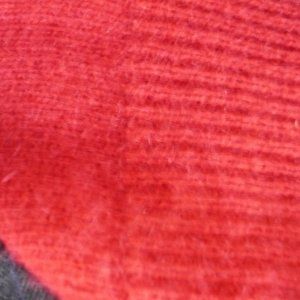 Tag reads 100% unknown fibers. But it definitely feels like a wool blend, if not 100% wool. Sleeves might be acrylic, but are very soft and could be merino or angora. Very good preowned condition.