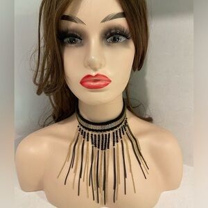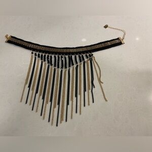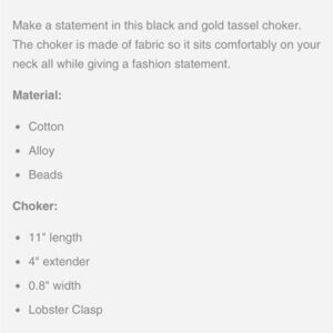 Black and gold whimsical tassel choker. The choker is made of fabric so it sits comfortably on your neck all while giving a fashion statement.