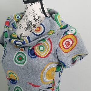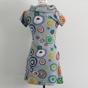 This mod-inspired mini by Koia explodes in spiral prints — a swirl of crayon rings on soft heather grey. The wide cowl neck and oversized buttons give it a playful sculptural edge, while the fitted cut and stretch cotton blend keep it comfy and flattering. Feels like candy, wears like confidence.