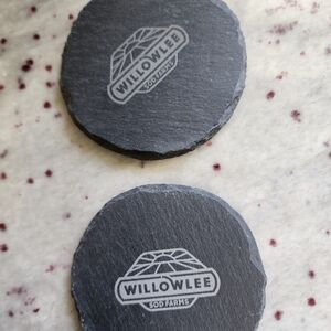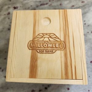 Elegant wooden box with Willowlee Sod Farms logo. Engraved whiskey stones and 2 stone coasters included.