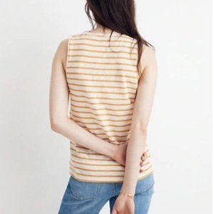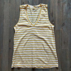 Features: V-Neck, sleeveless tank, mustard/bright yellow and white stripes, pocket on chest, light and airy slub cotton, flowy/drapey stretchy cotton