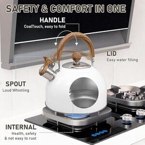 Fast boiling: The tea kettle has a ring layer at the bottom as heat exchanger for improving boiling efficiency, accelerating boiling time to save fuel. suitable for any kinds of stoves. Tips: Please pay attention not exceeding the water level line and the lid is sealed well, otherwise it will affect the whistle.