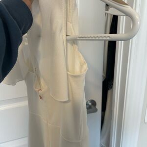 This enchanting white maxi dress features a sweetheart neckline and flutter sleeves, perfect for a bride for the wedding, reception or bridal shower. The asymmetrical wrap design with a high-low hemline adds a touch of elegance, while the cascading ruffles create a romantic and ethereal silhouette. Worn once to my wedding reception and cleaned afterwards. There is light discolouration on the inside of the right sleeve but it is not visible to others.