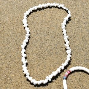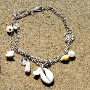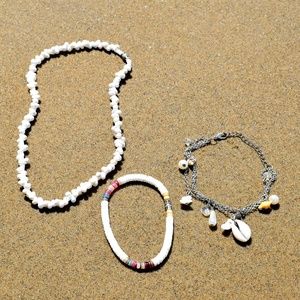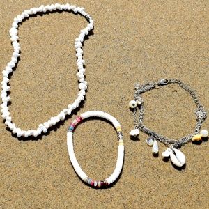 White Beaded Chocker, Puma Shell Bracelet & Silver Shell Adjustable Anklet Set