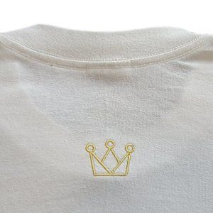 This limited edition heavy weight -white T-shirt, features full chest- silk screen Giffen Wild logo, along with an embroidered crown below the neck on the back of the garment. This item is new and comes in manufacturer packaging.