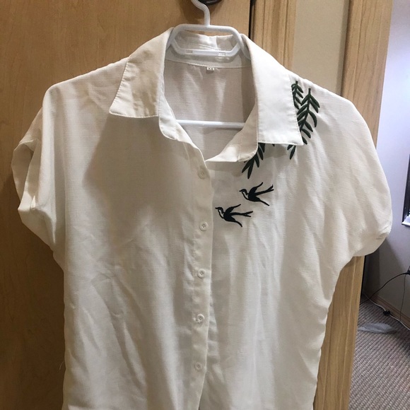 White blouse with tie. Birds and flower embroidered on the right side of the shirt. Worn once. Size M but fits more like a S