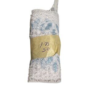 This elegant lace trim features a delicate floral embroidery in white and blue. Ideal for sewing, crafting, and decorative projects, adding sophistication.